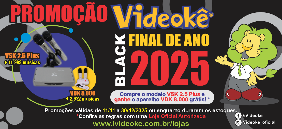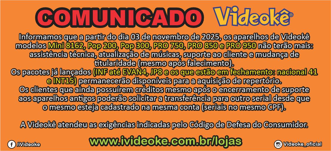 Informamos que a empresa Videokê® NÃO se responsabiliza por compra(s), venda(s) e troca(s) de aparelho(s) comprados em sites, lojas e/ou terceiros (pessoa física) não autorizados pela Videokê®. Leia os termos de uso com atenção.Qualquer música do repertório Videokê® , poderá ser retirado do site para a aquisição, a qualquer momento sem aviso prévio.